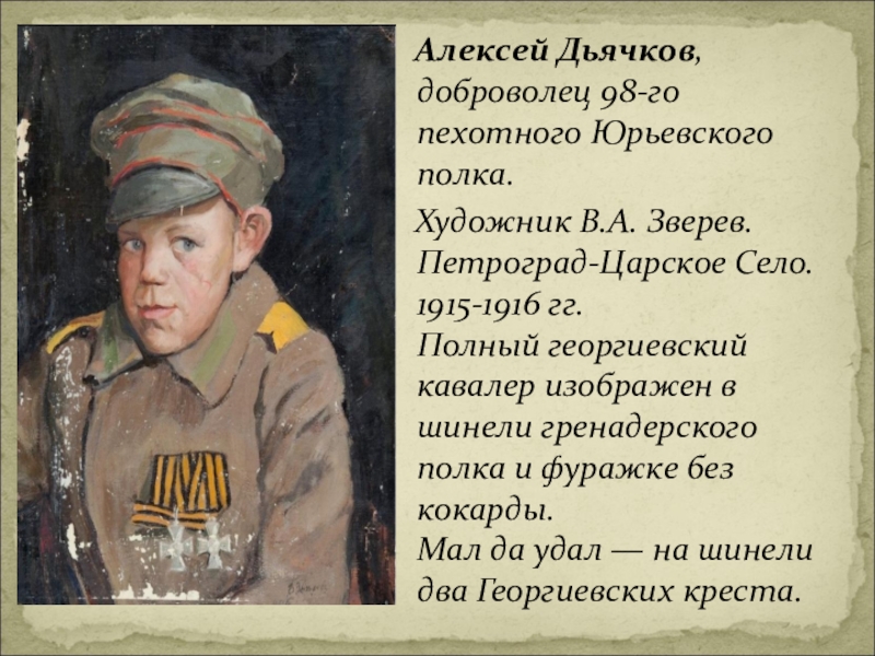 их подвигах на полях сражений, ранениях и боевых наградах. На войне они быстро становились взрослыми, стойко перенося окопные страдания и лишения, голод, холод и смерть боевых друзей. Проявляя чудеса самопожертвования и героизма, в свои 12-15 лет они нередко становились Георгиевскими кавалерами.