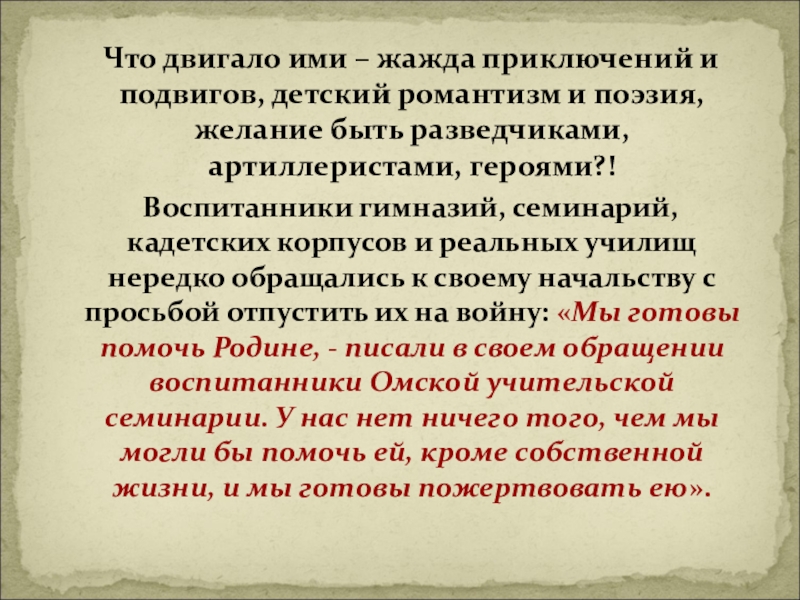 Воспитанники гимназий, семинарий, кадетских корпусов и реальных училищ нередко обращались к своему начальству с просьбой отпустить их на войну: «Мы готовы помочь Родине, - писали в своем обращении воспитанники Омской учительской семинарии. У нас нет ничего того, чем мы могли бы помочь ей, кроме собственной жизни, и мы готовы пожертвовать ею».