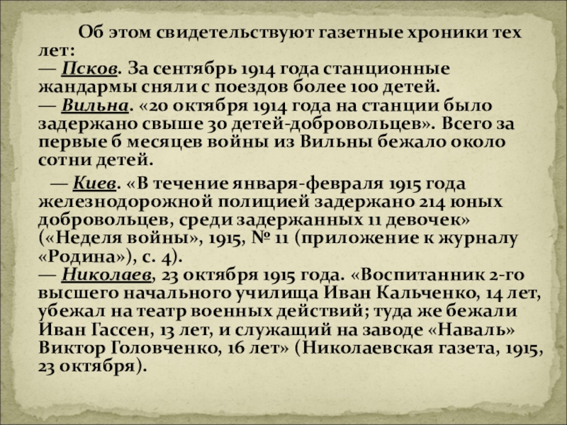 — Вильна. «20 октября 1914 года на станции было задержано свыше 30 детей-добровольцев». Всего за первые б месяцев войны из Вильны бежало около сотни детей.