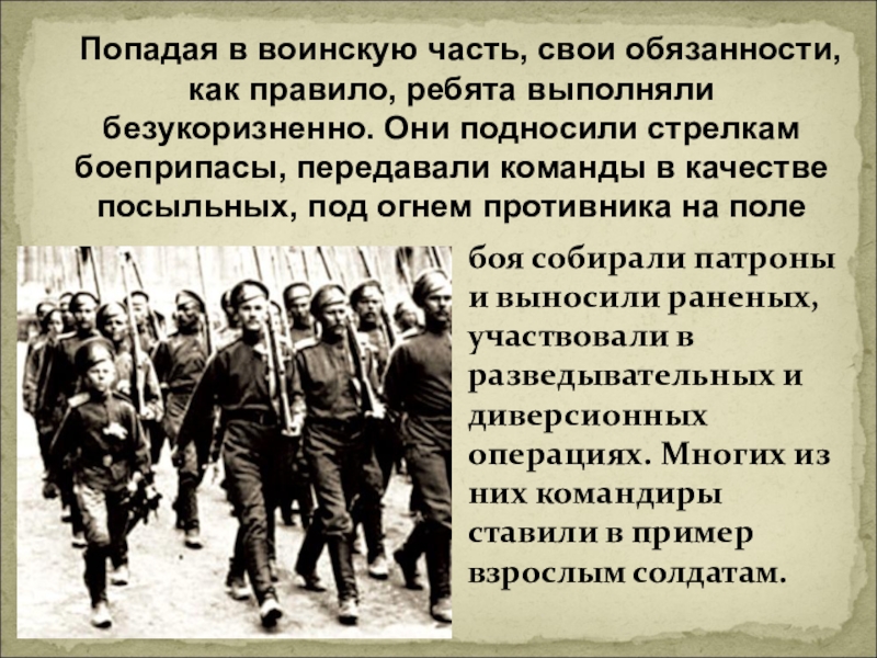 боя собирали патроны и выносили раненых, участвовали в разведывательных и диверсионных операциях. Многих из них командиры ставили в пример взрослым солдатам.