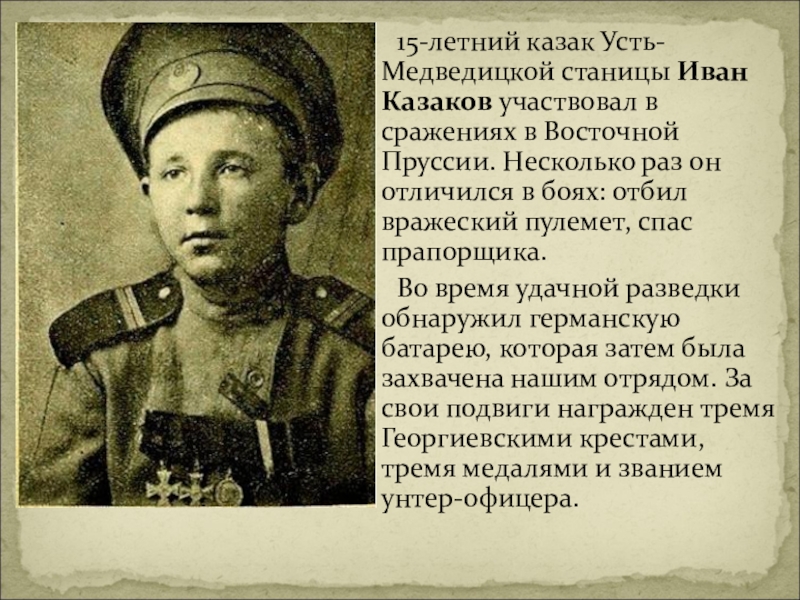 Слайд 13 15-летний казак Усть-Медведицкой станицы Иван Казаков участвовал в сражениях в Восточной