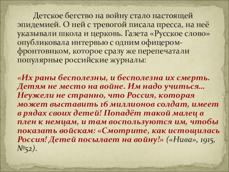 «Их раны бесполезны, и бесполезна их смерть. Детям не место на войне. Им надо учиться… Неужели не странно, что Россия, которая может выставить 16 миллионов солдат, имеет в рядах своих детей! Попадёт такой малец в плен к немцам, и там воспользуются им, чтобы показать войскам: «Смотрите, как истощилась Россия! Детей посылает на войну!» («Нива», 1915, №52).