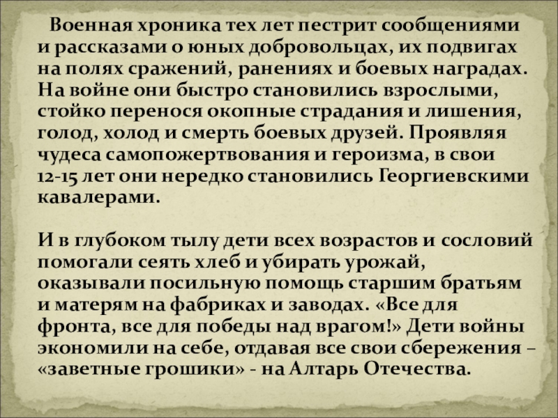 И в глубоком тылу дети всех возрастов и сословий помогали сеять хлеб и убирать урожай, оказывали посильную помощь старшим братьям и матерям на фабриках и заводах. «Все для фронта, все для победы над врагом!» Дети войны экономили на себе, отдавая все свои сбережения – «заветные грошики» - на Алтарь Отечества.