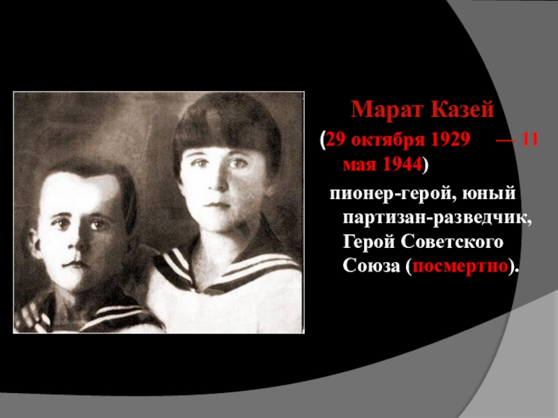 Марат Казей   Марат Казей (29 октября 1929   — 11 мая 1944)  пионер-герой, юный партизан-разведчик,