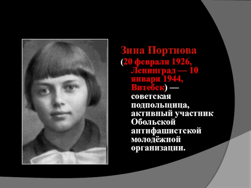 Зина ПортноваЗина Портнова (20 февраля 1926, Ленинград — 10 января 1944, Витебск) — советская подпольщица, активный участник