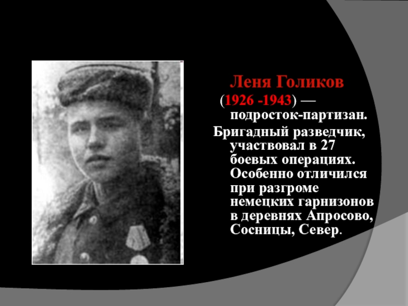 Леня ГоликовЛеня Голиков (1926 -1943) — подросток-партизан. Бригадный разведчик, участвовал в 27 боевых операциях. Особенно отличился при