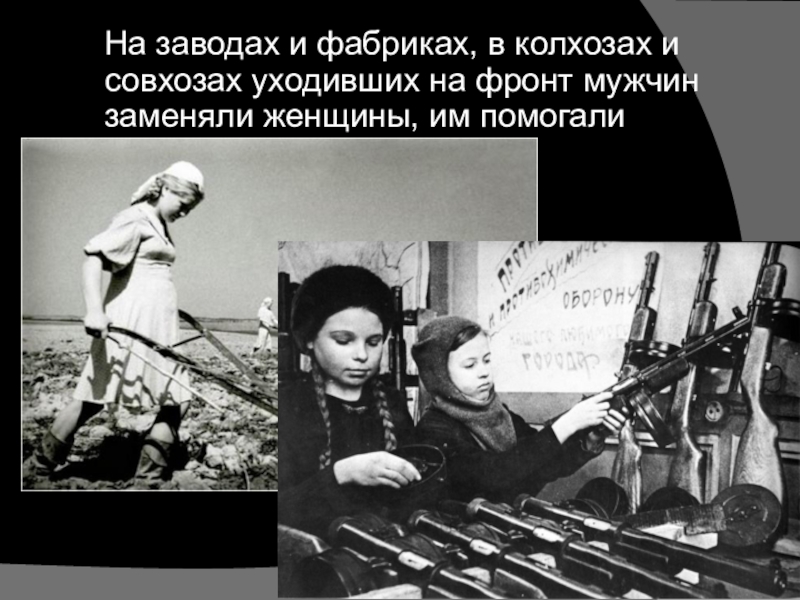 На заводах и фабриках, в колхозах и совхозах уходивших на фронт мужчин заменяли женщины, им помогали старики