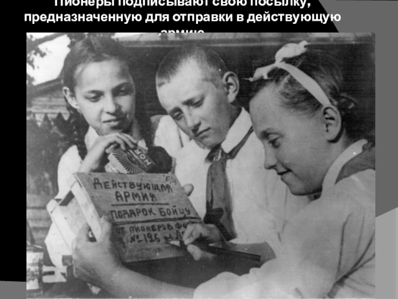 Слайд 33Пионеры подписывают свою посылку, предназначенную для отправки в действующую армию