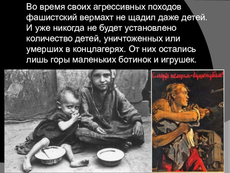 Слайд 18Во время своих агрессивных походов фашистский вермахт не щадил даже детей.