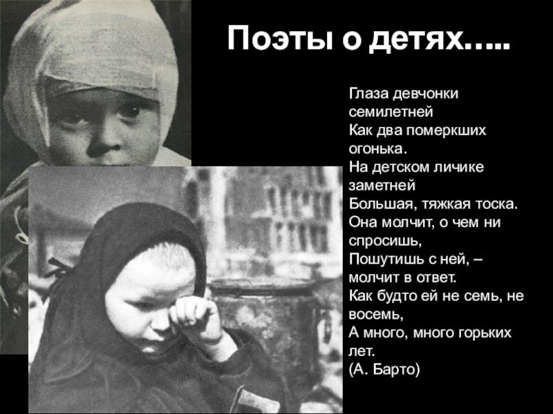 Поэты о детях…..Глаза девчонки семилетней Как два померкших огонька. На детском личике заметней Большая, тяжкая тоска. Она