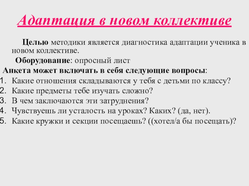 Анкета «Перспективы обучения и воспитания ребенка» 1. С каким чувством переступает порог школы ваш сын или дочь? 2. Как чувствует себя ваш ребенок в ученическом коллективе? 3. Знаете ли вы друзей и приятелей своего ребенка в коллективе? Назовите их. 4. Как складываются отношения с учителями-предметниками у