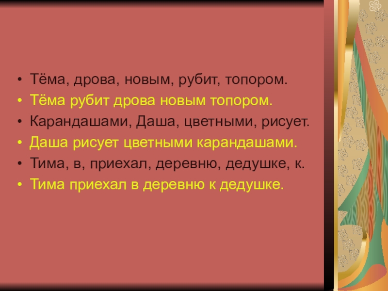 Тёма, дрова, новым, рубит, топором.Тёма рубит дрова новым топором.Карандашами, Даша, цветными, рисует.Даша рисует цветными карандашами.Тима, в, приехал,