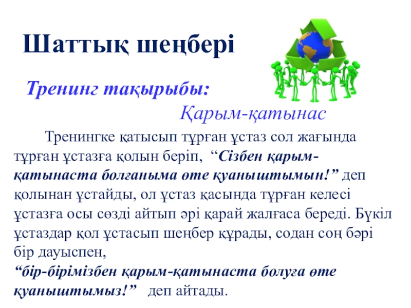 Тренингке қатысып тұрған ұстаз сол жағында тұрған ұстазға қолын беріп, “Сізбен қарым-қатынаста болғаныма өте қуаныштымын!” деп қолынан ұстайды, ол ұстаз қасында тұрған келесі ұстазға осы сөзді айтып әрі қарай жалғаса береді. Бүкіл ұстаздар қол ұстасып шеңбер құрады, содан соң бәрі бір дауыспен,