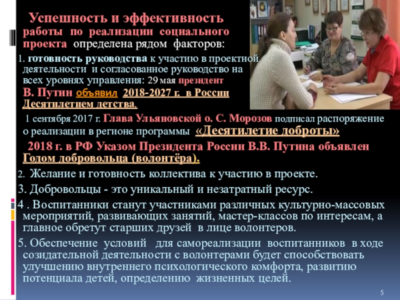 1. готовность руководства к участию в проектной деятельности и согласованное руководство на всех уровнях управления: 29 мая президент В. Путин объявил 2018-2027 г. в России Десятилетием детства.