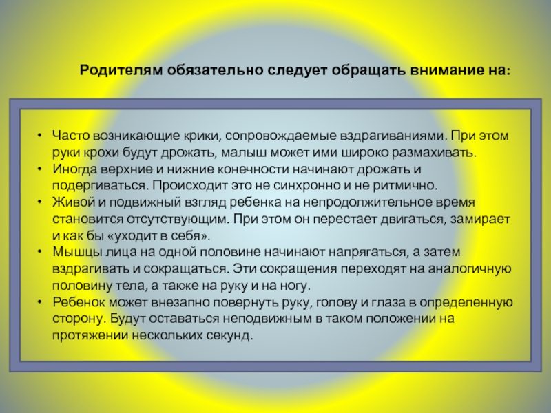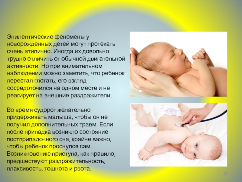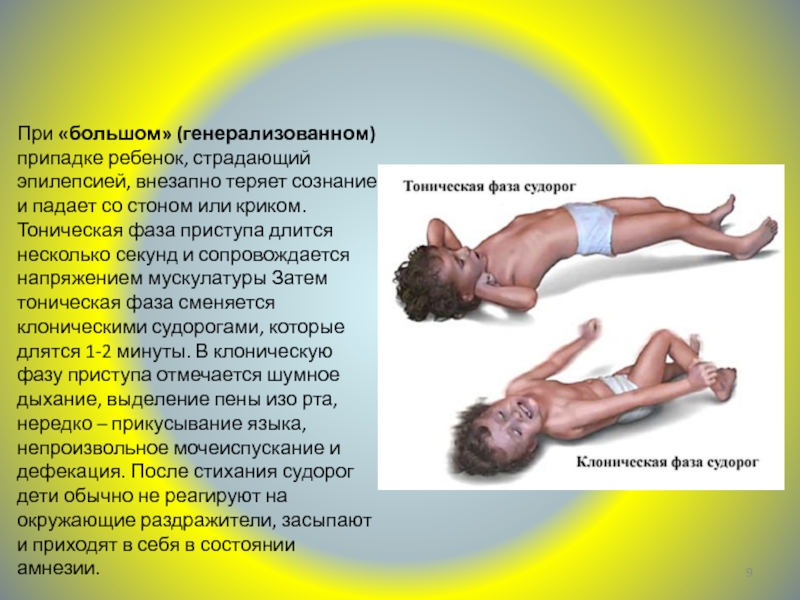 Во время судорог желательно придерживать малыша, чтобы он не получил дополнительных травм. Если после припадка возникло состояние постприпадочного сна, крайне важно, чтобы ребенок проснулся сам. Возникновению приступа, как правило, предшествуют раздражительность, плаксивость, тошнота и рвота.