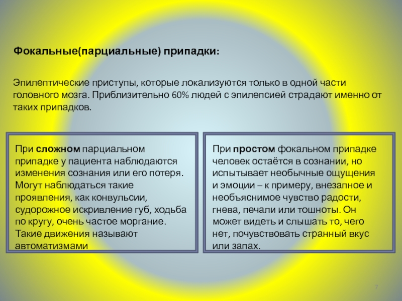При сложном парциальном припадке у пациента наблюдаются изменения сознания или его потеря. Могут наблюдаться такие проявления, как конвульсии, судорожное искривление губ, ходьба по кругу, очень частое моргание. Такие движения называют автоматизмами