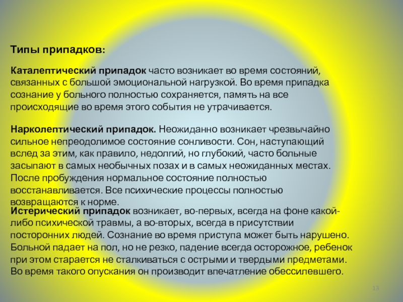 Нарколептический припадок. Неожиданно возникает чрезвычайно сильное непреодолимое состояние сонливости. Сон, наступающий вслед за этим, как правило, недолгий, но глубокий, часто больные засыпают в самых необычных позах и в самых неожиданных местах. После пробуждения нормальное состояние полностью восстанавливается. Все психические процессы полностью возвращаются к норме.