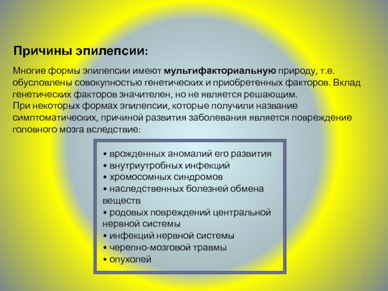 Многие формы эпилепсии имеют мультифакториальную природу, т.е. обусловлены совокупностью генетических и приобретенных факторов. Вклад генетических факторов значителен, но не является решающим.