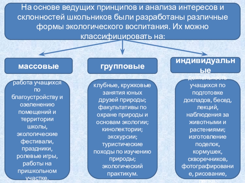 клубные, кружковые занятия юных друзей природы; факультативы по охране природы и основам экологии; кинолектории; экскурсии; туристические походы по изучению природы; экологический практикум.