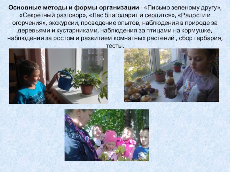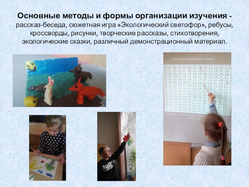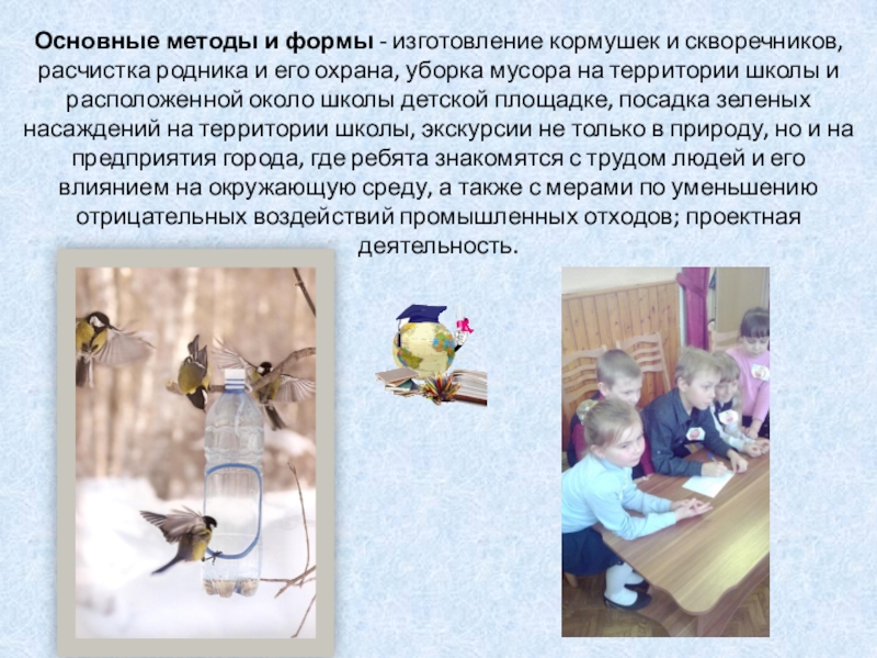 деятельность учащихся по подготовке докладов, бесед, лекций, наблюдения за животными и растениями; изготовление поделок, кормушек, скворечников, фотографирование, рисование, лепка.