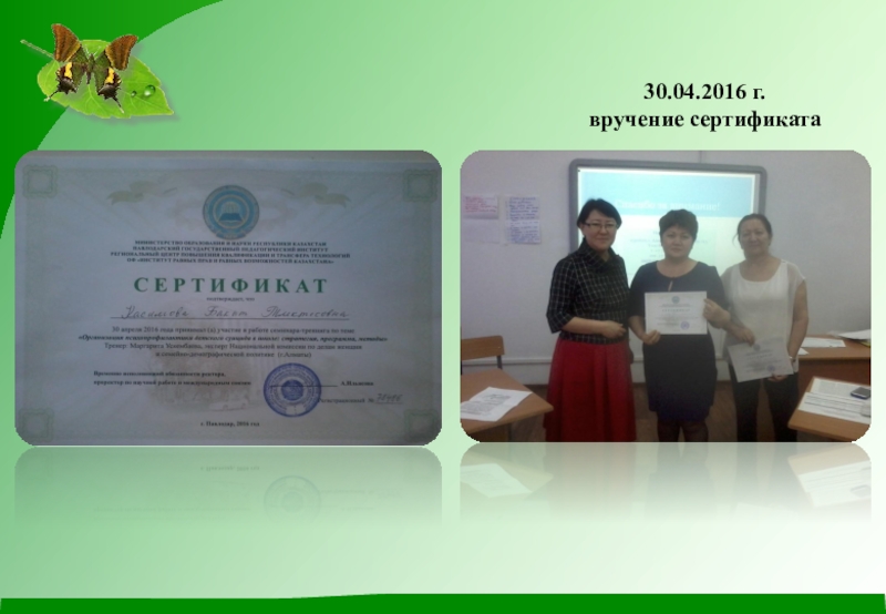 - біліктілігін арттыру курсы: 30 апреля 2016 год. Семинар тренинг при ПГПИ на тему: «Организация психопрофилактики детского суицида в школе: стратегия,программа, методы»