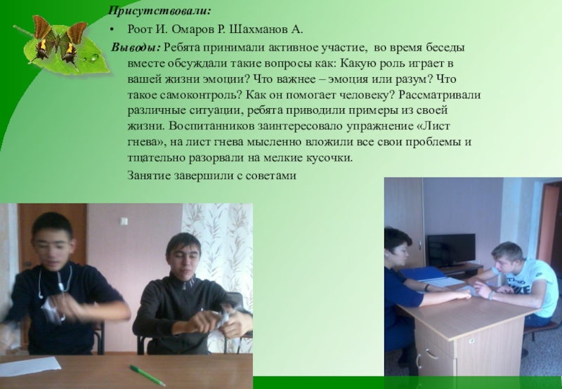 участие, во время беседы вместе обсуждали такие вопросы как: Какую роль играет в вашей жизни эмоции? Что важнее – эмоция или разум? Что такое самоконтроль? Как он помогает человеку? Рассматривали различные ситуации, ребята приводили примеры из своей жизни. Воспитанников заинтересовало упражнение «Лист гнева», на лист гнева мысленно вложили все свои проблемы и тщательно разорвали на мелкие кусочки.
