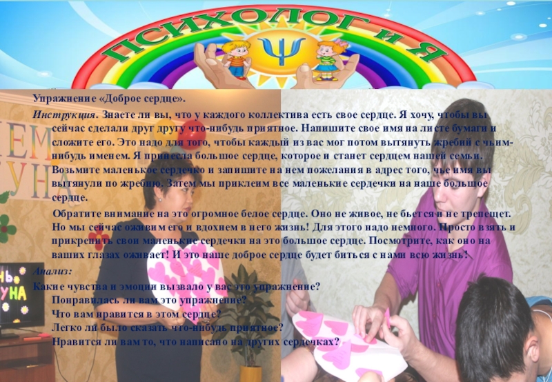 сердце. Я хочу, чтобы вы сейчас сделали друг другу что-нибудь приятное. Напишите свое имя на листе бумаги и сложите его. Это надо для того, чтобы каждый из вас мог потом вытянуть жребий с чьим-нибудь именем. Я принесла большое сердце, которое и станет сердцем нашей семьи. Возьмите маленькое сердечко и запишите на нем пожелания в адрес того, чье имя вы вытянули по жребию. Затем мы приклеим все маленькие сердечки на наше большое сердце.