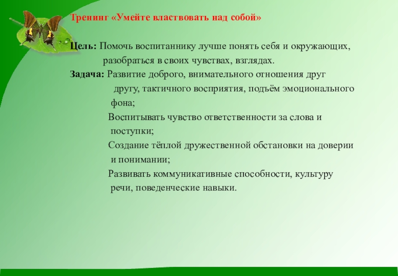 Слайд 10Тренинг «Умейте властвовать над собой»