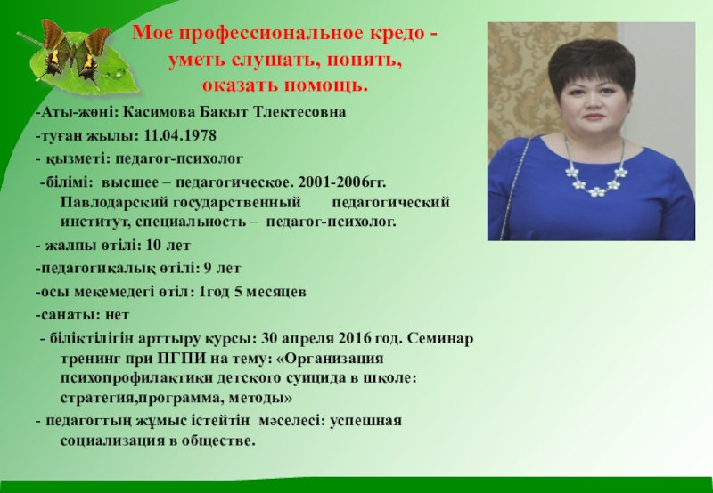 -білімі: высшее – педагогическое. 2001-2006гг. Павлодарский государственный педагогический институт, специальность – педагог-психолог.