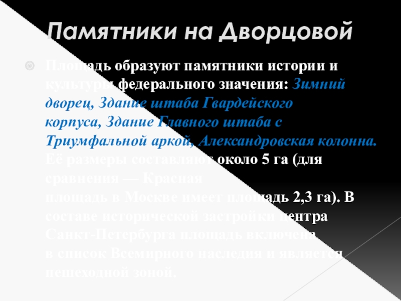 штаба Гвардейского корпуса, Здание Главного штаба с Триумфальной аркой, Александровская колонна. Её размеры составляют около 5 га (для сравнения — Красная площадь в Москве имеет площадь 2,3 га). В составе исторической застройки центра Санкт-Петербурга площадь включена в список Всемирного наследия и является пешеходной зоной.