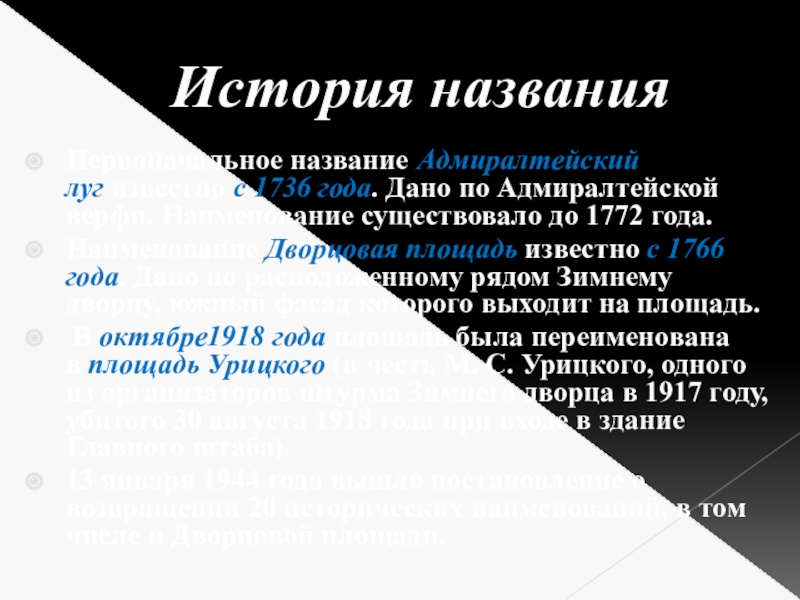 История названия Первоначальное название Адмиралтейский луг известно с 1736 года. Дано по Адмиралтейской верфи. Наименование существовало до 1772 года.Наименование Дворцовая площадь известно с 1766 года.