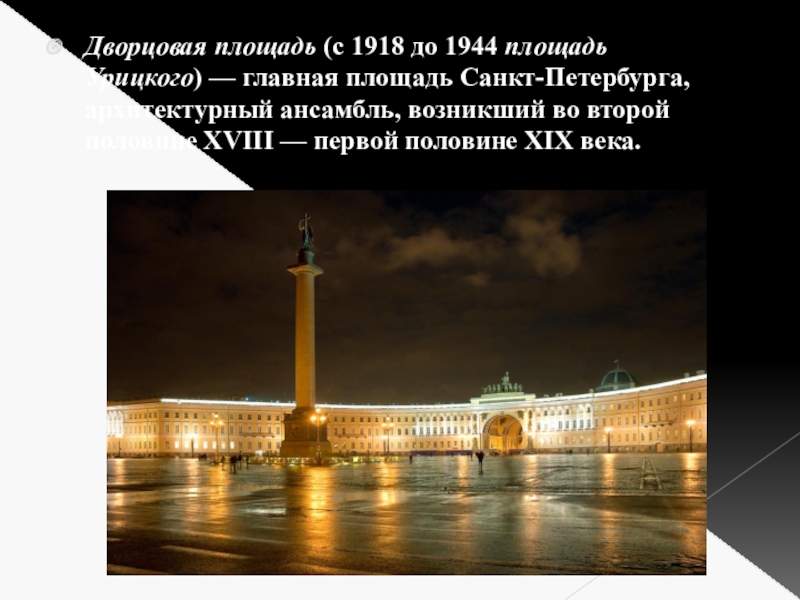 Дворцовая площадь (с 1918 до 1944 площадь Урицкого) — главная площадь Санкт-Петербурга, архитектурный ансамбль, возникший