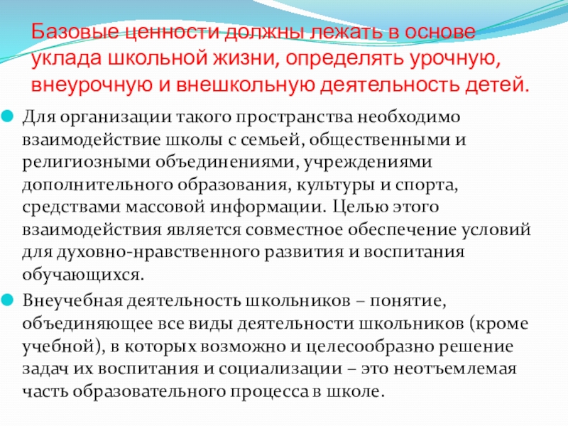 Для организации такого пространства необходимо взаимодействие школы с семьей, общественными и религиозными объединениями, учреждениями дополнительного образования, культуры и спорта, средствами массовой информации. Целью этого взаимодействия является совместное обеспечение условий для духовно-нравственного развития и воспитания обучающихся.