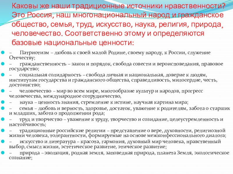 – гражданственность – закон и порядок, свобода совести и вероисповедания, правовое государство;