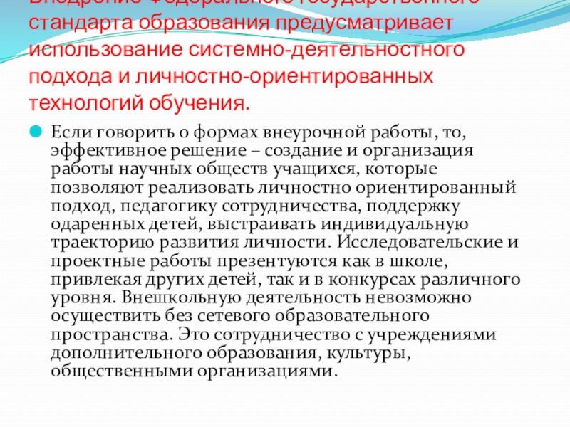 Если говорить о формах внеурочной работы, то, эффективное решение – создание и организация работы научных обществ учащихся, которые позволяют реализовать личностно ориентированный подход, педагогику сотрудничества, поддержку одаренных детей, выстраивать индивидуальную траекторию развития личности. Исследовательские и проектные работы презентуются как в школе, привлекая других детей, так и в конкурсах различного уровня. Внешкольную деятельность невозможно осуществить без сетевого образовательного пространства. Это сотрудничество с учреждениями дополнительного образования, культуры, общественными организациями.