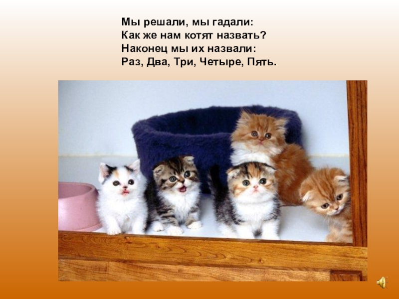 Мы решали, мы гадали:Как же нам котят назвать?Наконец мы их назвали:Раз, Два, Три, Четыре, Пять.