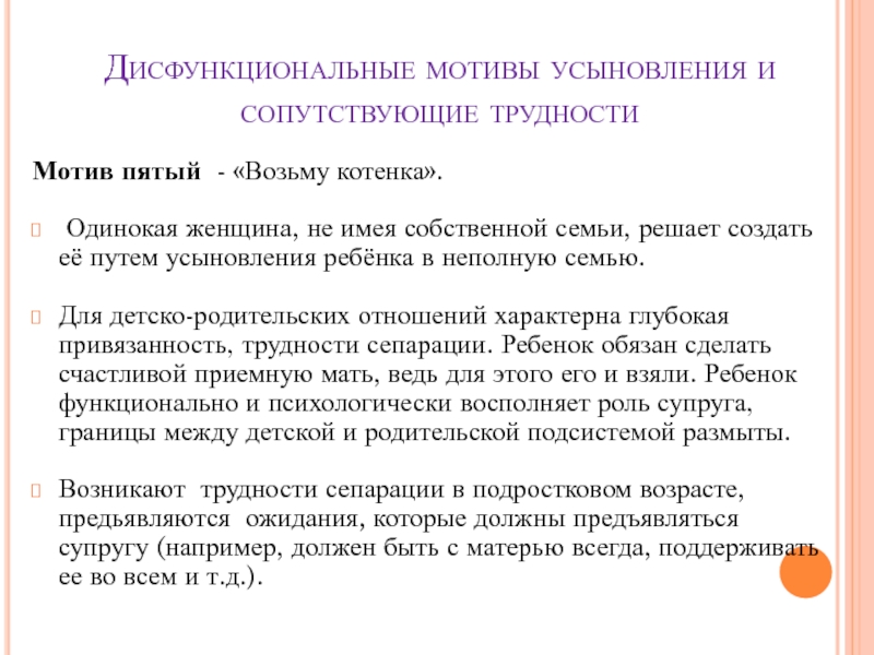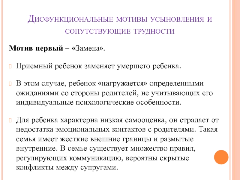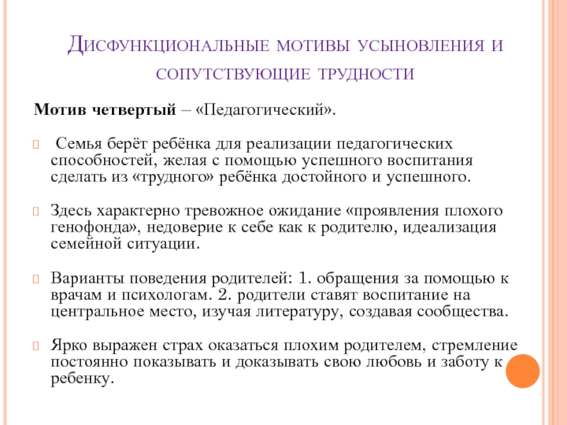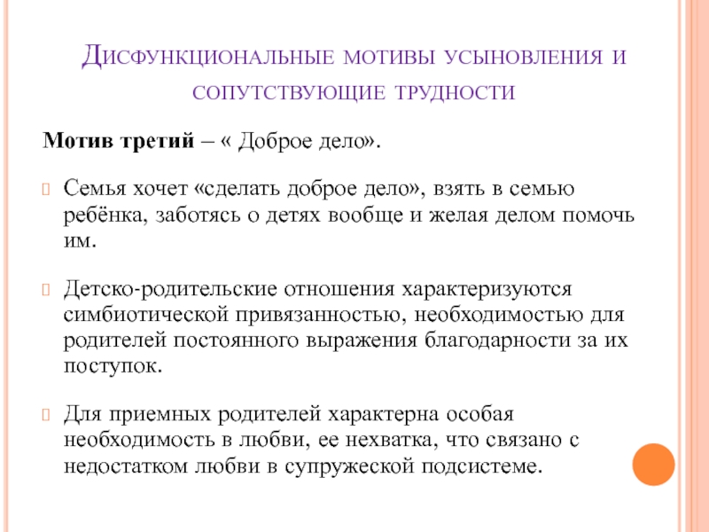 Слайд 10Дисфункциональные мотивы усыновления и сопутствующие трудности