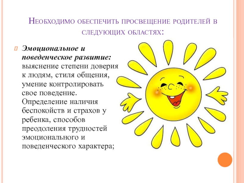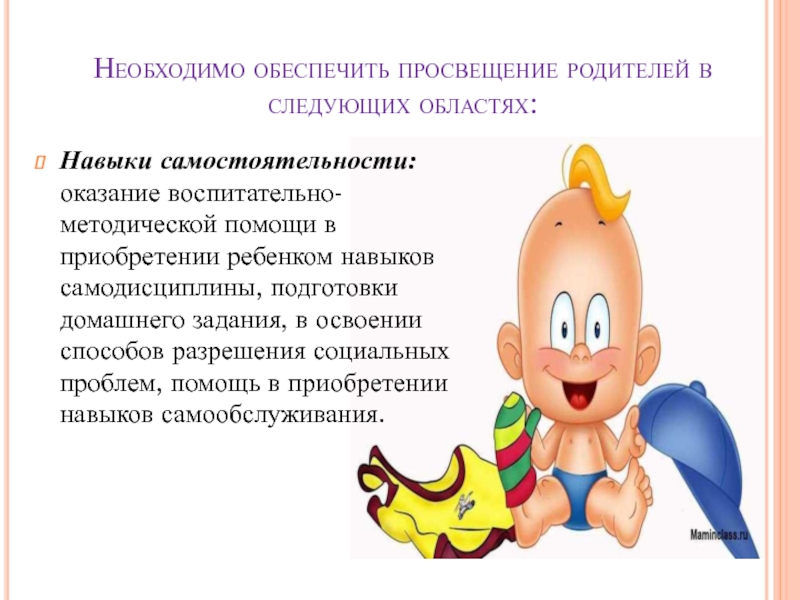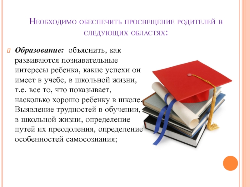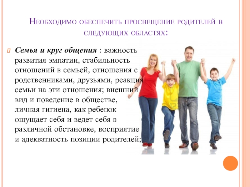 Слайд 21Необходимо обеспечить просвещение родителей в следующих областях: