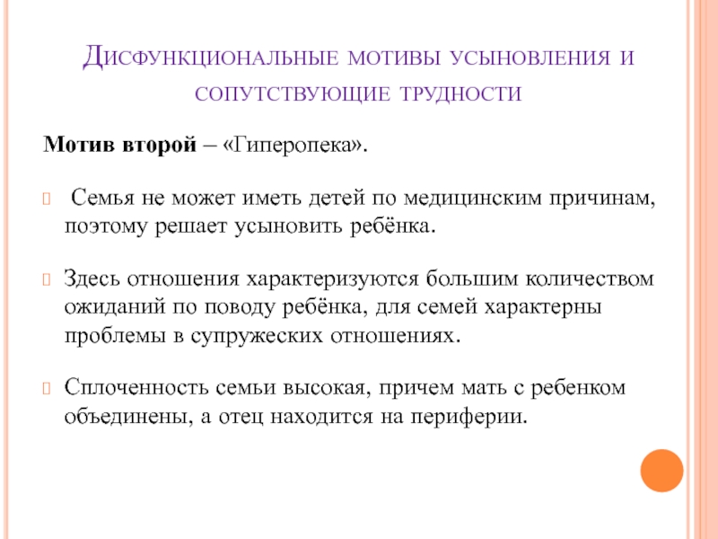 Слайд 12Дисфункциональные мотивы усыновления и сопутствующие трудности