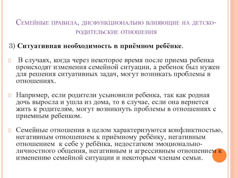 Семейные отношения в целом характеризуются конфликтностью, негативным отношением к приёмному ребёнку, негативным отношением к себе у ребёнка, недостатком эмоционально-личностного общения, негативным и агрессивным отношением к изменению семейной ситуации и некоторым членам семьи.