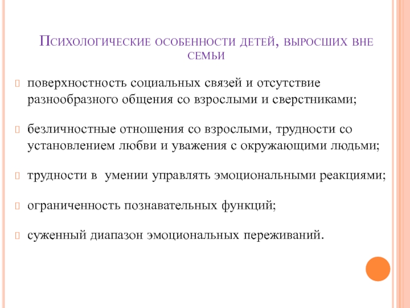 Слайд 7Психологические особенности детей, выросших вне семьи
