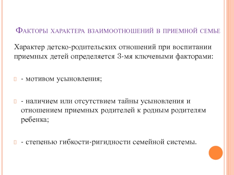Слайд 8Факторы характера взаимоотношений в приемной семье