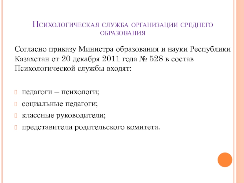 Казахстан от 20 декабря 2011 года № 528 в состав Психологической службы входят: