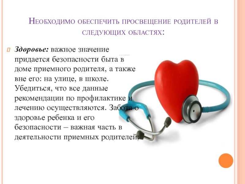быта в доме приемного родителя, а также вне его: на улице, в школе. Убедиться, что все данные рекомендации по профилактике и лечению осуществляются. Забота о здоровье ребенка и его безопасности – важная часть в деятельности приемных родителей;