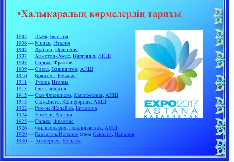 “ЭКСПО” ҰҒЫМЫМЕН , ДҮНИЕ ЖҮЗІЛІК КӨРМЕЛЕРДІҢ ТАРИХЫМЕН ТАНЫСТЫРУ. ҚАЗАҚСТАНДА ӨТЕТІН