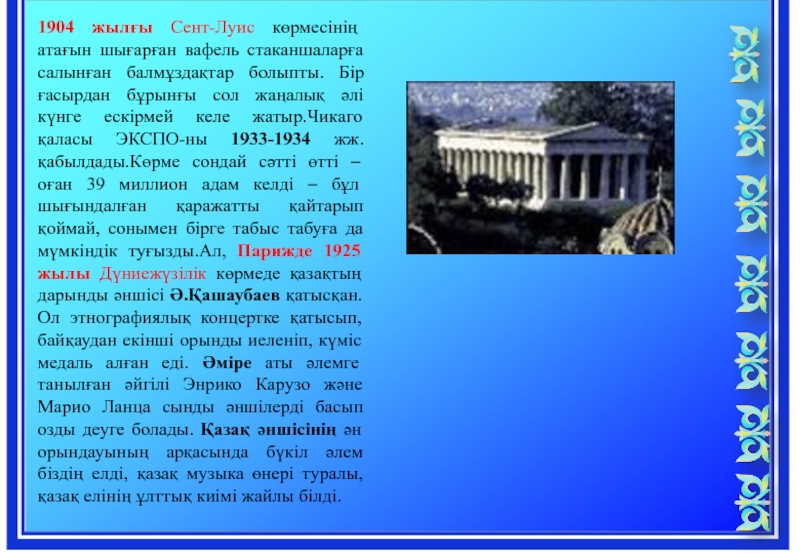 Бір ғасырдан бұрынғы сол жаңалық әлі күнге ескірмей келе жатыр.Чикаго қаласы ЭКСПО-ны 1933-1934 жж. қабылдады.Көрме сондай сәтті өтті – оған 39 миллион адам келді – бұл шығындалған қаражатты қайтарып қоймай, сонымен бірге табыс табуға да мүмкіндік туғызды.Ал, Парижде 1925 жылы Дүниежүзілік көрмеде қазақтың дарынды әншісі Ә.Қашаубаев қатысқан.Ол этнографиялық концертке қатысып, байқаудан екінші орынды иеленіп, күміс медаль алған еді. Әміре аты әлемге танылған әйгілі Энрико Карузо және Марио Ланца сынды әншілерді басып озды деуге болады. Қазақ әншісінің ән орындауының арқасында бүкіл әлем біздің елді, қазақ музыка өнері туралы, қазақ елінің ұлттық киімі жайлы білді.