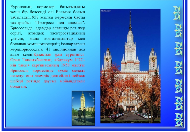 көрменің басты тақырыбы: "Прогресс пен адамзат". Брюссельде адамдар алғашқы рет жер серігі, атомдық электростацияның үлгісін, жаңа қозғалтқыштар мен болашақ компьютерлердің ізашарларын көрді.Брюссельге 41 миллионнан аса адам келді.Қазақтың ұлы суретшісі Орал Таңсықбаевтың «Қарақұм ГЭС-нің таңы» картинасының 1958 жылғы Брюссель көрмесінде күміс медаль иеленуі оны әлемдік деңгейдегі пейзаж шебері ретінде даусыз мойындатқан болатын.