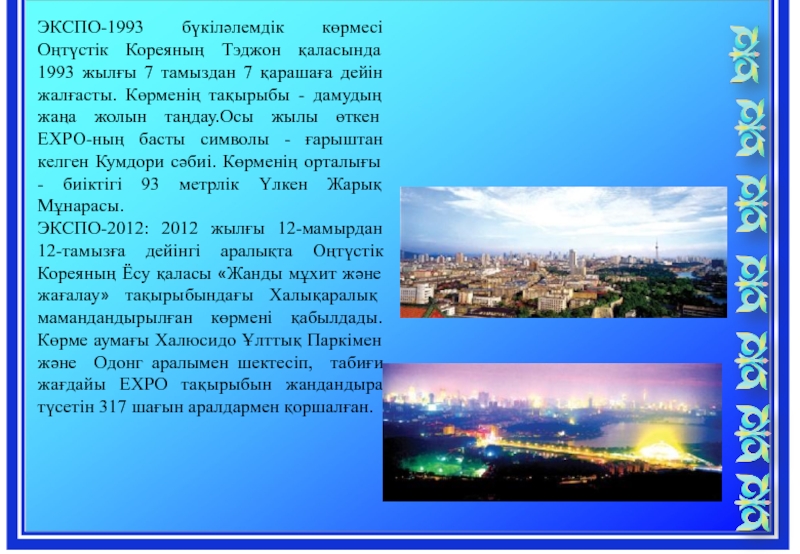 Слайд 17ЭКСПО-1993 бүкіләлемдік көрмесі Оңтүстік Кореяның Тэджон қаласында 1993 жылғы 7 тамыздан
