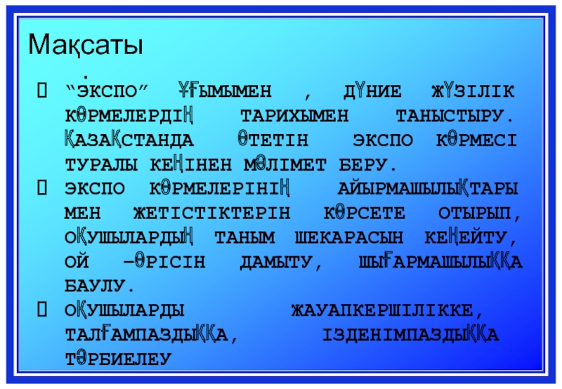 ЭКСПО КӨРМЕЛЕРІНІҢ АЙЫРМАШЫЛЫҚТАРЫ МЕН ЖЕТІСТІКТЕРІН КӨРСЕТЕ ОТЫРЫП, ОҚУШЫЛАРДЫҢ ТАНЫМ ШЕКАРАСЫН КЕҢЕЙТУ, ОЙ –ӨРІСІН ДАМЫТУ, ШЫҒАРМАШЫЛЫҚҚА БАУЛУ.