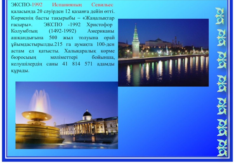 Слайд 18ЭКСПО-1992 Испанияның Севильес қаласында 20 сәуірден 12 қазанға дейін өтті. Көрменің
